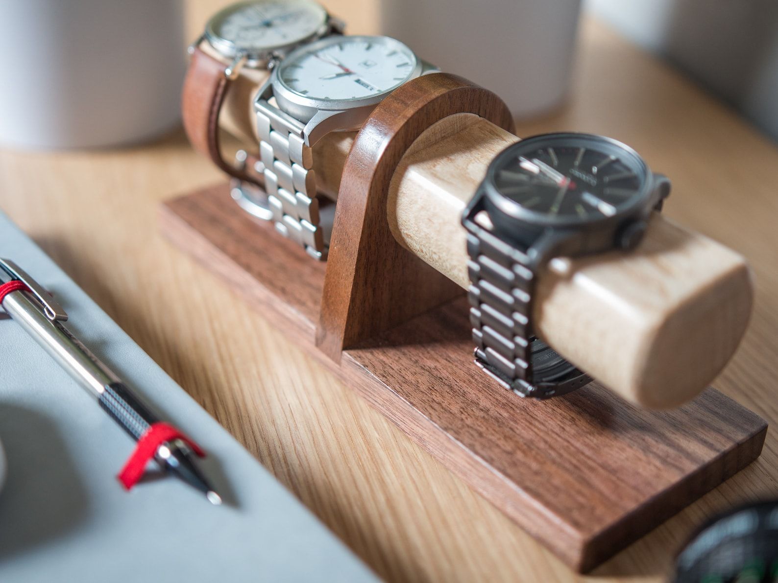Mỗi chiếc Giá treo đồng hồ đeo tay được chế tác từ gỗ tự nhiên nguyên khối như walnut hoặc maple. Màu sắc, vân gỗ hoàn toàn tự nhiên, không sử dụng bất kỳ hóa chất tạo màu nào. Chính điều này giúp từng sản phẩm là độc nhất vô nhị – không chiếc nào giống chiếc nào, từ sắc độ cho đến đường vân.